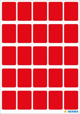 Herma Vario 15 x 20 mm méretű, kis kiszerelésű, piros színű, matt felületű, kézzel írható öntapadó jelölő címke, permanens ragasztóval, kerekített sarkokkal. Egy csomagban 5 darab 84 x 120 mm-es lapon összesen 125 darab (laponként 25 darab), külön-külön leválasztható, piros színű jelölő címke található.