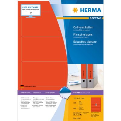 Herma piros színű nyomtatható, nagy fedőképességű, öntapadó iratrendező címke A4-es lapon, 192 x 61 mm-es méretben, kerekített sarkokkal, normál ragasztóval. (Herma 4297)