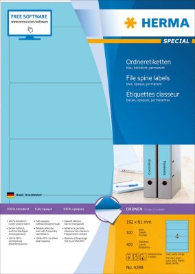 Herma kék színű nyomtatható, nagy fedőképességű, öntapadó iratrendező címke A4-es lapon, 192 x 61 mm-es méretben, kerekített sarkokkal, normál ragasztóval. (Herma 4298)