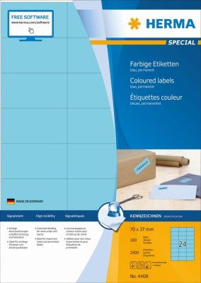 • Herma No. 4408 kék színű 70 x 37 mm méretű, univerzálisan nyomtatható, matt felületű öntapadós etikett címke, permanens ragasztóval A4-es íven - kiszerelés: 2400 címke / 100 ív