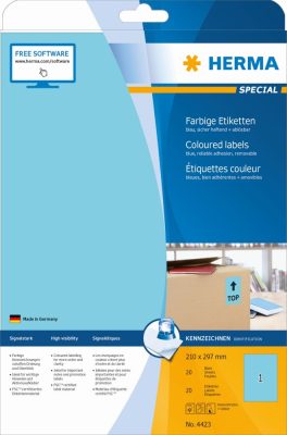 Herma No. 4423 kék színű 210 x 297 mm méretű, univerzálisan nyomtatható, matt felületű öntapadós etikett címke, visszaszedhető ragasztóval A4-es íven - kiszerelés: 20 címke / 20 ív