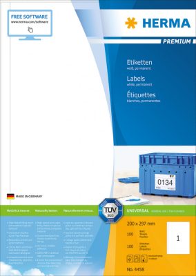 • Herma No. 4458 fehér színű 200 x 297 mm méretű, univerzálisan nyomtatható, öntapadós etikett címke, permanens ragasztóval A4-es íven - kiszerelés: 100 címke / 100 ív