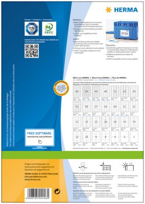 Herma prémium nyomtatható öntapadós címkék általános felhasználásra és címzésekre. Magas minőség, kiváló nyomtatási kép, erős és megbízható tapadás jellemzi. A Herma prémium nyomtatható öntapadós etikett címkéi megfelelnek a legszigorúbb minőségi és technológiai elvárásoknak is. A Herma prémium címke és a csomagolás 100%-ban újrahasznosítható alapanyagokból készül.