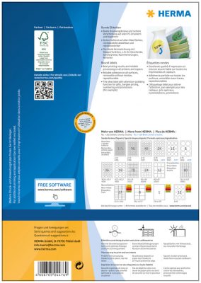 A Herma nyomtatható öntapadós címkéi kompatibilisek az általánosan forgalomban lévő irodai nyomtatókkal. Négy papírmentes lapszéllel rendelkezik, mely ragasztómentes terület biztosítja, hogy nyomtatás közben ne kerülhessen ragasztómaradvány és egyéb szennyező anyag a nyomtató hengereire, görgőire, dobegységére. Így elkerülhetővé válik a címkék feltapadása a nyomtató belső alkatrészeire.