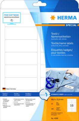 Herma No. 4588 fehér színű 88,9 x 33,8 mm méretű, lézernyomtatóval nyomtatható, textilre ragasztható öntapadós névcímke, visszaszedhető ragasztóval A4-es íven - kiszerelés: 160 címke / 10 ív