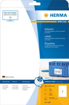 • Herma No. 4824 tintasugaras 210 x 297 mm méretű, fehér öntapadós etikett címke A4-es íven - 25 etikett címke / csomag - 25 ív / csomag (Herma 4824)