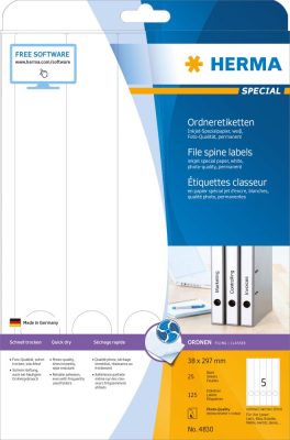 Herma fehér színű nyomtatható, nagy fedőképességű, öntapadó iratrendező címke A4-es lapon, 38 x 297 mm-es méretben, kerekített sarkokkal, normál ragasztóval, kifejezetten tintasugaras nyomtatókhoz. (Herma 4830)