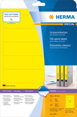 Herma No. 5091 univerzális 192 x 38 mm méretű, sárga öntapadó iratrendező címke A4-es íven - 140 iratrendező címke / csomag - 20 ív / csomag (Herma 5091)