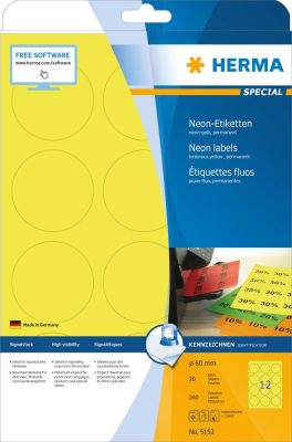 Herma No. 5152 univerzális 60 mm átmérőjű, neonsárga színű öntapadó etikett címke A4-es íven - 240 etikett címke / csomag - 20 ív / csomag (Herma 5152)