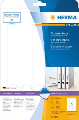 • Herma No. 5158 univerzális 34 x 297 mm méretű, fehér öntapadó iratrendező címke A4-es íven - 125 iratrendező címke / csomag - 25 ív / csomag (Herma 5158)