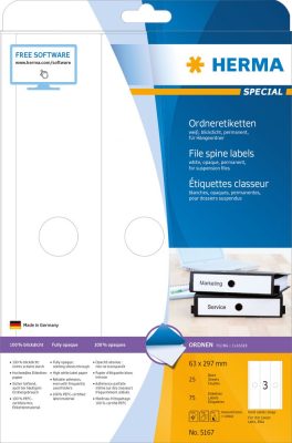 • Herma No. 5167 univerzális 63 x 297 mm méretű, fehér öntapadó függőmappa címke A4-es íven - 75 függőmappa címke / csomag - 25 ív / csomag (Herma 5167)
