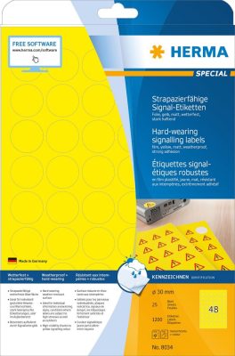 • Herma No. 8034 sárga színű 30 mm átmérőjű, lézernyomtatóval nyomtatható, öntapadós időjárásálló etikett címke, extra erős, tartós ragasztóval A4-es íven - kiszerelés: 1200 címke / 25 ív