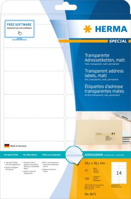 Herma No. 8671 átlátszó 99,1 x 38,1 mm méretű, lézernyomtatóval nyomtatható, matt felületű öntapadós etikett címke, permanens ragasztóval A4-es íven - kiszerelés: 350 címke / 25 ív