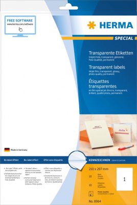 • Herma No. 8964 tintasugaras 210 x 297 mm méretű, víztiszta, átlátszó öntapadó etikett címke A4-es íven - 10 etikett címke / csomag - 10 ív / csomag (Herma 8964)