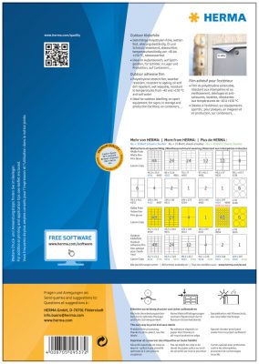 A Herma nyomtatható öntapadós címkéi kompatibilisek az általánosan forgalomban lévő irodai nyomtatókkal. A címkeív teljesen sík felületű, valamint négy papírmentes lapszéllel rendelkezik, mely ragasztómentes terület biztosítja, hogy nyomtatás közben ne kerülhessen ragasztómaradvány és egyéb szennyező anyag a nyomtató hengereire, görgőire, dobegységére. Ezáltal elkerülhetővé válik a címkék feltapadása a nyomtató belső alkatrészeire.