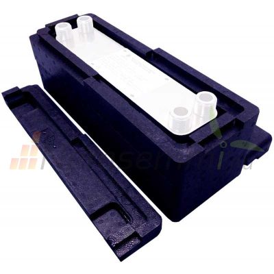 A szigetelés anyag fekete EPP hab, ez sokkal jobb szigetelést biztosít, mint a hagyományos poliuretánhab. A szigetelés vastagsága akár 24 mm is lehet. Maximális ajánlott üzemi hőmérséklet 115°C. A lemezes hőcserélő szigetelés olyan termék, amely a fűtőközeg hőmérsékletét növeli a hőcserélő lehető legmagasabb hatásfokának elérése érdekében. Ez úgy történik, hogy megakadályozza a hőveszteséget a hőcserélő külseje felé, azaz hőenergiát ad a külső térbe. Ez a fűtési rendszer és a fűtési költségek optimalizálása szempontjából fontos, mivel javítja a két közeg közötti hőcsere hatékonyságát. Ez pedig energiamegtakarítást és a CU vagy a használati melegvíz-fűtési rendszer jobb működését eredményezi. A hőcserélő szigetelését megfelelő hőszigetelő anyaggal kell megvalósítani.