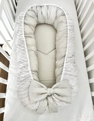 • HOPE babafészek halványszürke minky és pamutvászon kombinációval – puha, biztonságos ölelés újszülötteknek