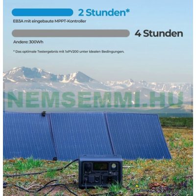 Napelemes (200W): ≈1,8-2,0 óra (Elsődleges napsütés, ideális tájolás és alacsony hőmérséklet mellett)
