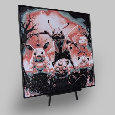 Ez a Hueforge kép egy merész és egyedi megközelítést mutat be a Pokémonok világáról, "zombi" stílusban ábrázolva Pikachut és társait. Ez a nem mindennapi alkotás szakít a megszokott aranyos képpel, és egy sötétebb, vöröses árnyalatú, posztapokaliptikus hangulatot teremt.