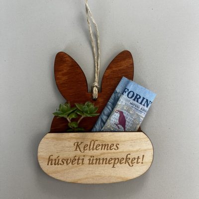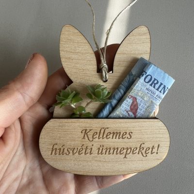 A gravírozott fa nyuszi húsvéti hangulatot ad, a bankjegy pedig szépen elhelyezhető benne – így az ajándék nem csak praktikus, hanem emlékezetes is.