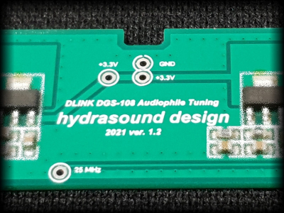 D-Link DGS 108e modifikációja, precízebb órajellel, szeparált tápellátással, extreme alacsony zaj és jitter.