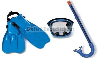 - Hypoallergén anyagból készült búvárszemüveg - Közepes méretű kék pipaszár - 37-40,5-es méretű uszony, rugalmas műanyagból