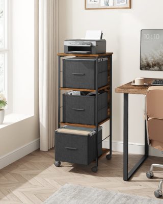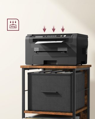iratszekrény 3 fiókkal, nyomtatóállvány, A4-es, Letter méretű irattartók, függő irattartók, irattároló doboz, otthoni iroda, rusztikus barna és fekete
