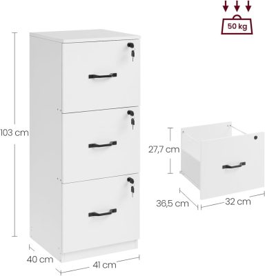 Iratszekrény, irodai szekrény otthoni irodához, nyomtatóállvány 3 zárható fiókkal, állítható akasztórúd, A4-es és betűformátumok, felhőfehér