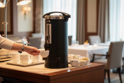 A cseppmentes adagolócsap tiszta és kontrollált kiöntést biztosít, így ideális önkiszolgáló környezetben is. A vízszintjelző segít a folyadékszint folyamatos ellenőrzésében, míg a biztonsági termosztát védi a készüléket a túlmelegedéstől.