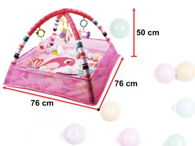 A szönyeg boltívrészére akasztható színes játékok felkeltik a baba figyelmét és motiválják a mozgásra, ezzel is erősítve a nyak a kar és a láb izmait.