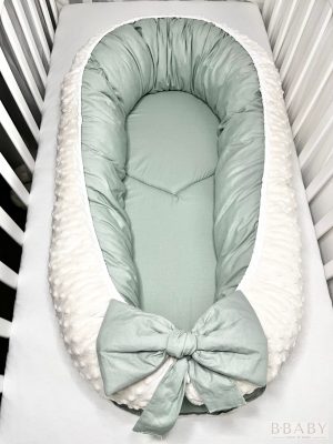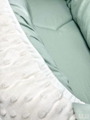 Joey – Babafészek olivazöld és krém színben | Pamutvászon, buborékos minky, 60x85 cm