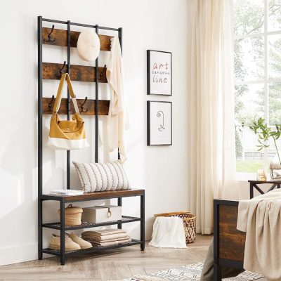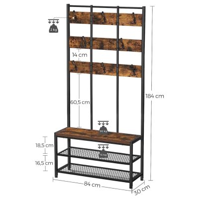 kabáttartó 8 kampóval és üléssel, 2 hálós polccal, előszoba, nappali, fém keret, ipari stílusú, vintage barna/fekete: