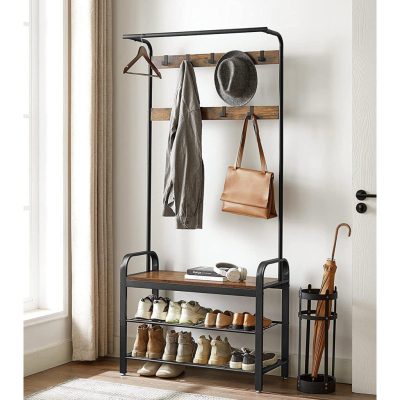 Ez a kabáttartó robusztus szerkezetű és jó stabilitású. Felteheti a cipőjét a padra.