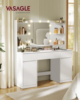 Bőséges tárolóhely:A 107 cm széles asztallap, 3 fiók, 2 szekrény (mindegyik állítható polccal) és 8 nyitott rekesz rengeteg helyet kínál a szépségápolási termékeidnek.