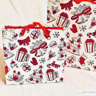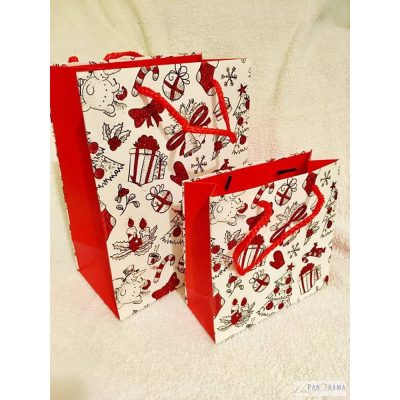 Karácsonyi mintázatú,csillámos díszítésű zsinóros dísztasak , vastag, jó minőségű.
