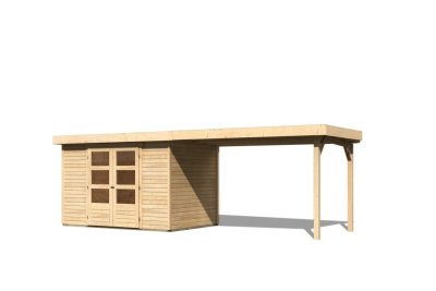 új Karibu Askola 4. Lapostetős kerti ház, kerti tároló, bővítménnyel/terasszal natúr fából 557 cm x 217 cm
