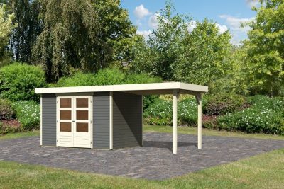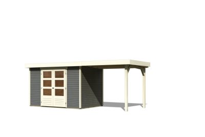 új Karibu Askola 4. Lapostetős kerti ház, kerti tároló, bővítménnyel/terasszal terra szürke színű fából 522 cm x 217 cm