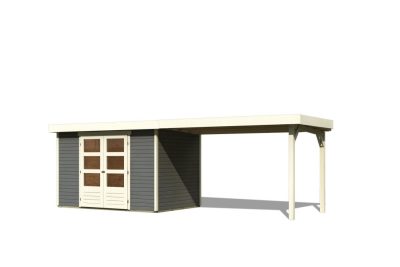 • Karibu Askola 4. Lapostetős kerti ház, kerti tároló, bővítménnyel/terasszal terra szürke színű fából 557 cm x 217 cm