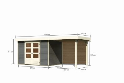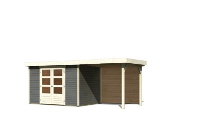 új Karibu Askola 4. Lapostetős kerti ház, kerti tároló, hátfallal rendelkező bővítménnyel/terasszal terra szürke színű fából 522 cm x 217 cm
