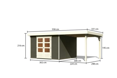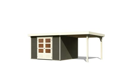 új Karibu Askola 6. Lapostetős, nagyméretű kerti ház, kerti tároló, bővítménnyel/terasszal terra szürke színű fából 522 cm x 306 cm