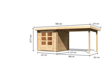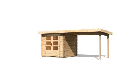 új Karibu Bastrup 2. Kerti ház, 3 m széles bővítménnyel/terasszal, natúr fából 519 cm x 237 cm