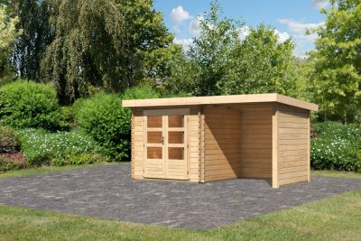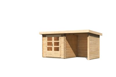 • Karibu Bastrup 2. Kerti ház, oldal- és hátfallal rendelkező 2 m széles bővítménnyel/terasszal, natúr fából 419 cm x 237 cm