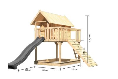 A teraszra történő kényelmes feljutást egy strapabíró falétra segíti. A játszóház teljes mérete 198 x 243 x 329,5 cm, így tágas belső teret biztosít a kreatív, fantáziadús szerepjátékokhoz. A tömörfa nyeregtető nemcsak esztétikus megjelenést kölcsönöz, hanem megbízható védelmet is biztosít az időjárással szemben. Az 5,9 m²-es tetőfelület a teraszt is lefedi, így a gyerekek egész évben gondtalanul élvezhetik a játék örömét.