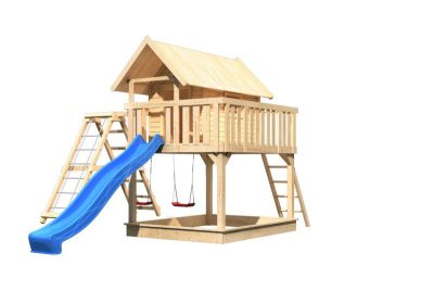 • Karibu Fidel 2. cölöpös fa játszóház létrával, kültéri kerti játszóház, kék csúszdával, dupla hintával, mászókával