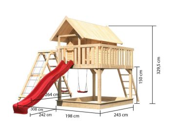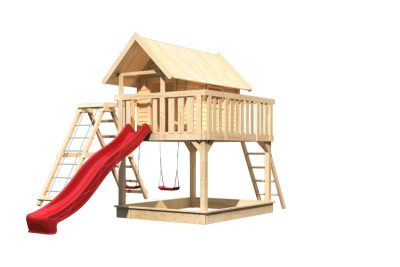 • Karibu Fidel 2. cölöpös fa játszóház létrával, kültéri kerti játszóház, piros csúszdával, dupla hintával, mászókával