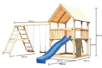 • Karibu Luis 2. Játszótorony kék csúszdával, dupla hintával, mászókával, mászófallal, létrával