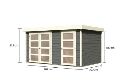 • Karibu Mühlentrup 2. Nagyméretű, 2 részre osztott kerti ház lapostetővel, terra szürke színű fából 404 cm x 272 cm