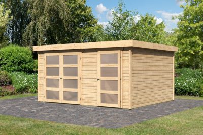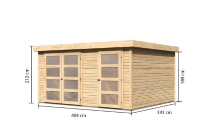 • Karibu Mühlentrup 3. Nagyméretű, 2 részre osztott kerti ház lapostetővel, natúr fából 404 cm x 332,5 cm