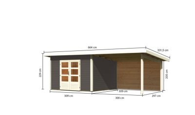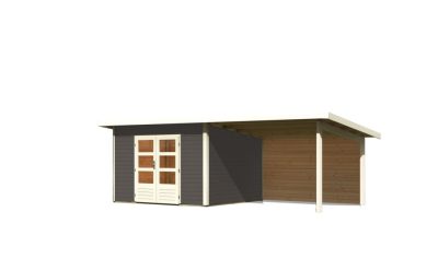 • Karibu Northeim 3. Kerti ház hátfallal rendelkező bővítménnyel/terasszal, terra szürke színű fából 604 cm x 309 cm