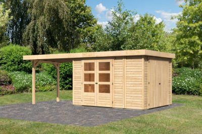 új Karibu Retola 4. Lapostetős nagyméretű kerti ház beépített oldalsó tárolóval, bővítménnyel/terasszal, natúr fából 572 cm x 246 cm